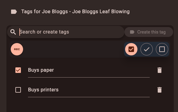 Tag edit page. The "Buys paper" tag is enabled, while the "Buys printers" tag is